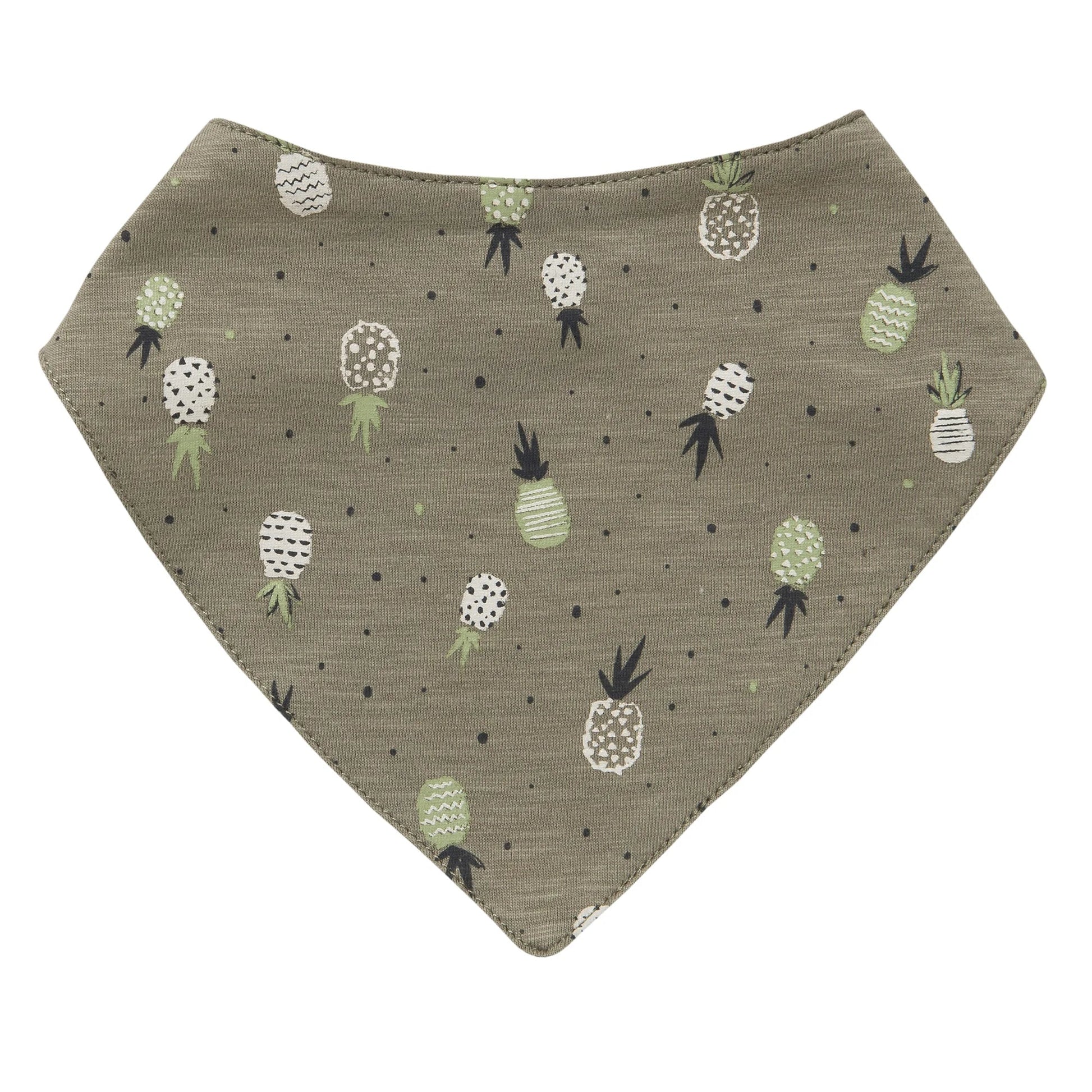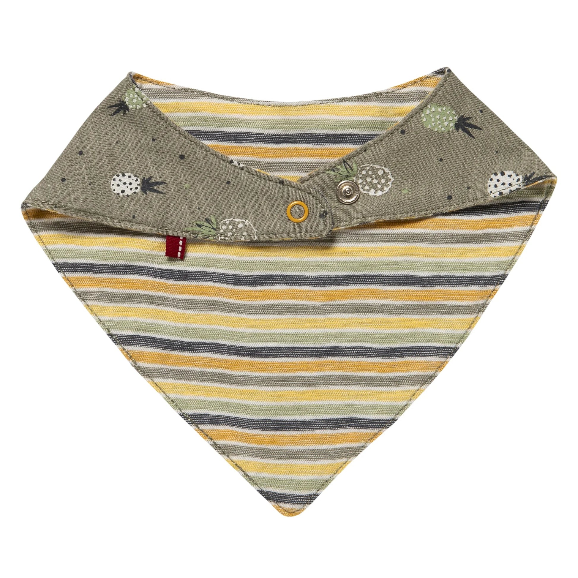 Dreieckstuch zum Wenden, zwei Designs, eine Seite in khaki bedruckt mit Ananas, die andere Seite in bunt geringelt, Weite durch farblich abgesetzte Druckknöpfe regulierbar