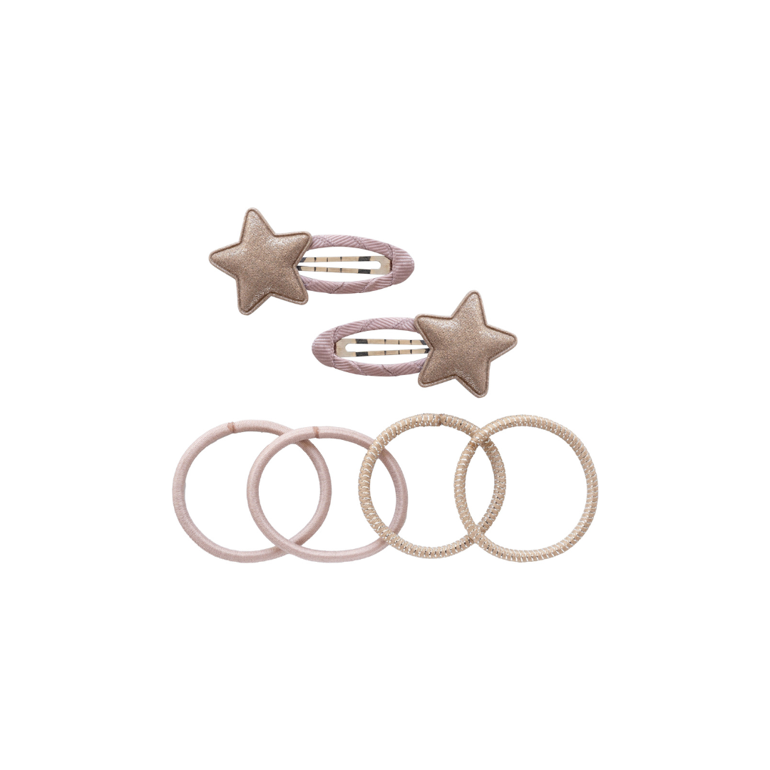 Perfect Match! Das Set besteht aus zwei Haarklammern mit glitzernden Sternen und farblich passenden Haargummis. Die Haarspangen sind zu vielen Anlässen leicht zu kombinieren und machen auch ein schönes Geschenk!